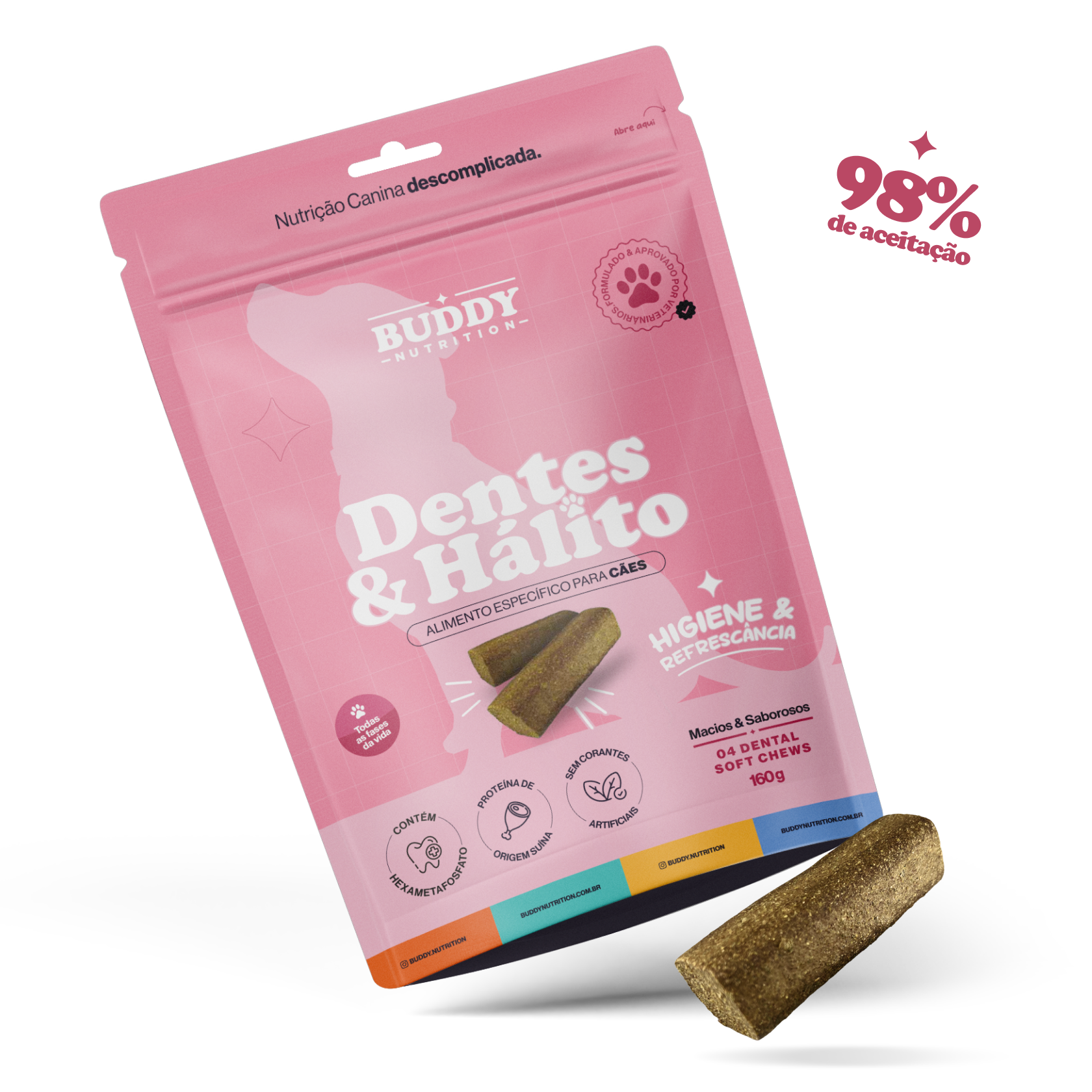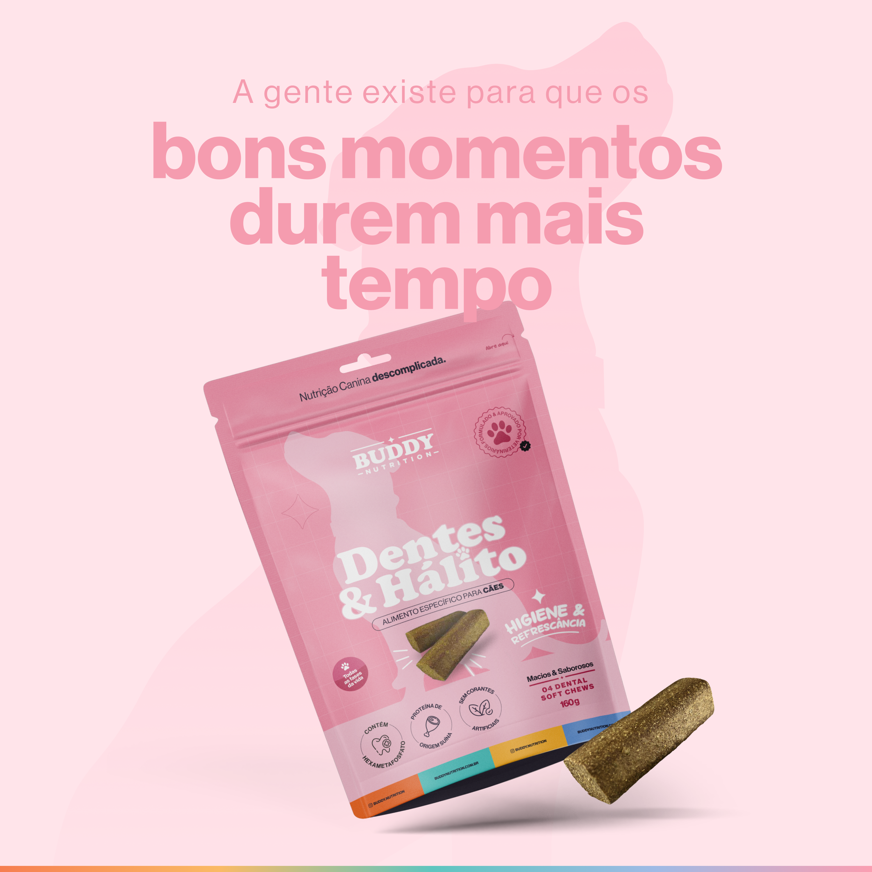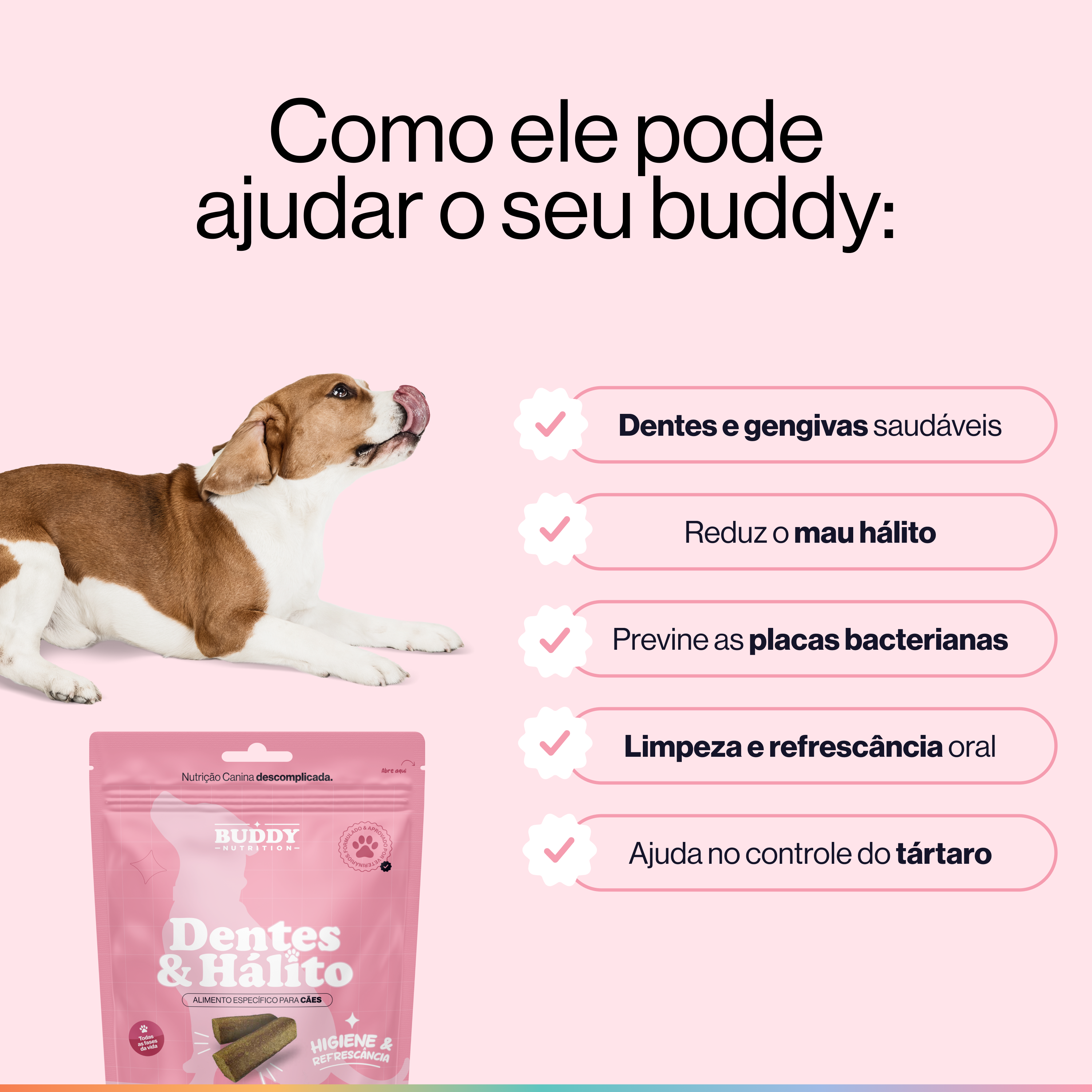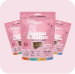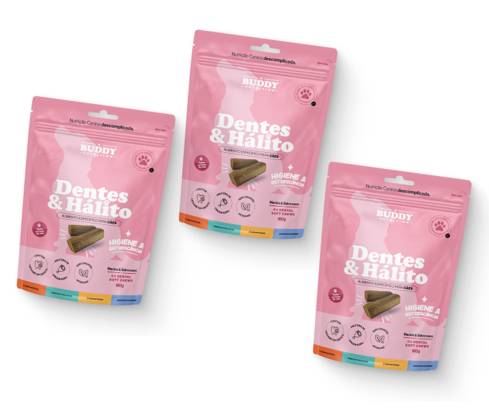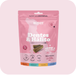 E para que esse cuidado realmente faça parte da rotina, o Dentes & Hálito é um suplemento em formato de petisco mastigável, com sabor de carne suína e alta palatabilidade.