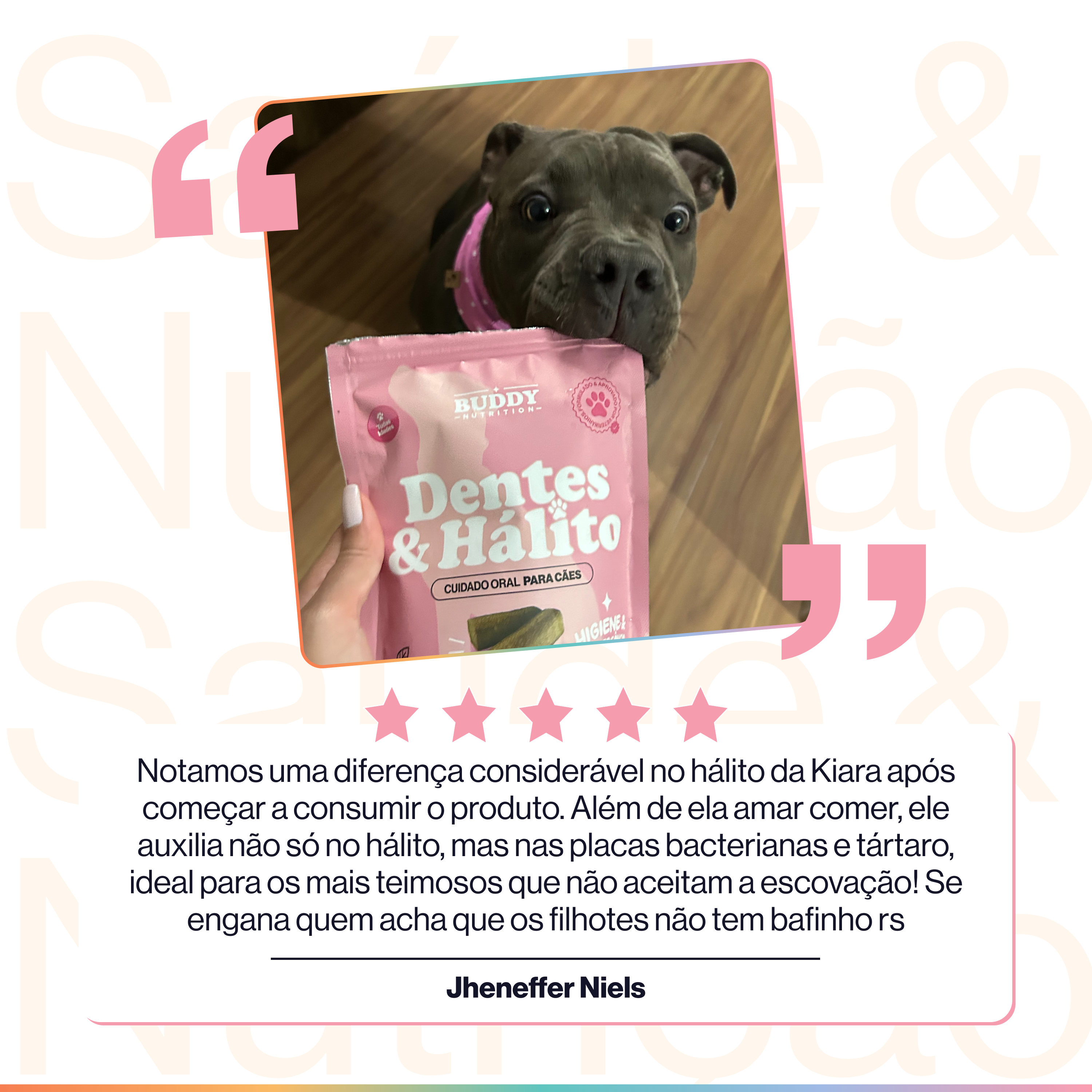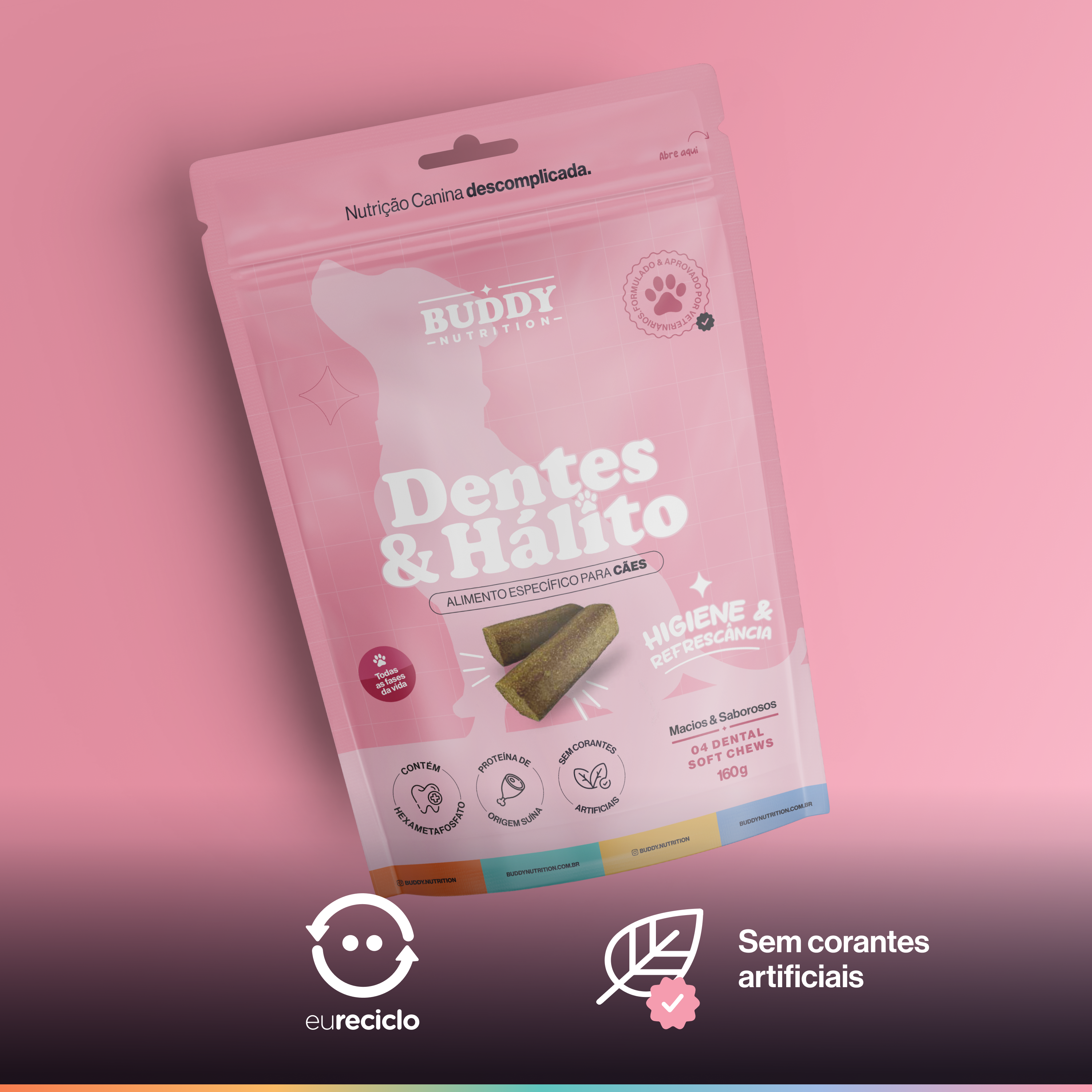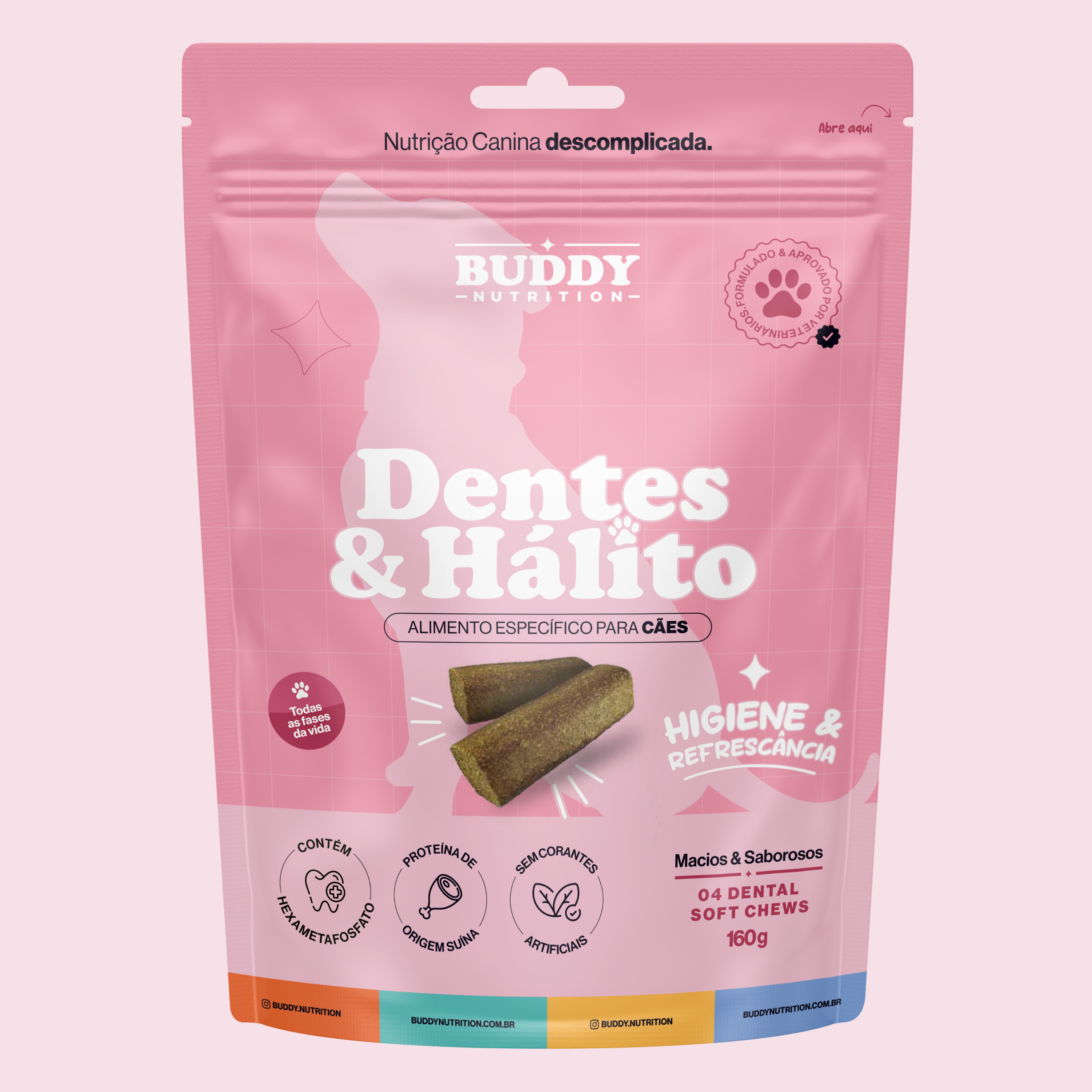 E para que esse cuidado realmente faça parte da rotina, o Dentes & Hálito é um suplemento em formato de petisco mastigável, com sabor de carne suína e alta palatabilidade.