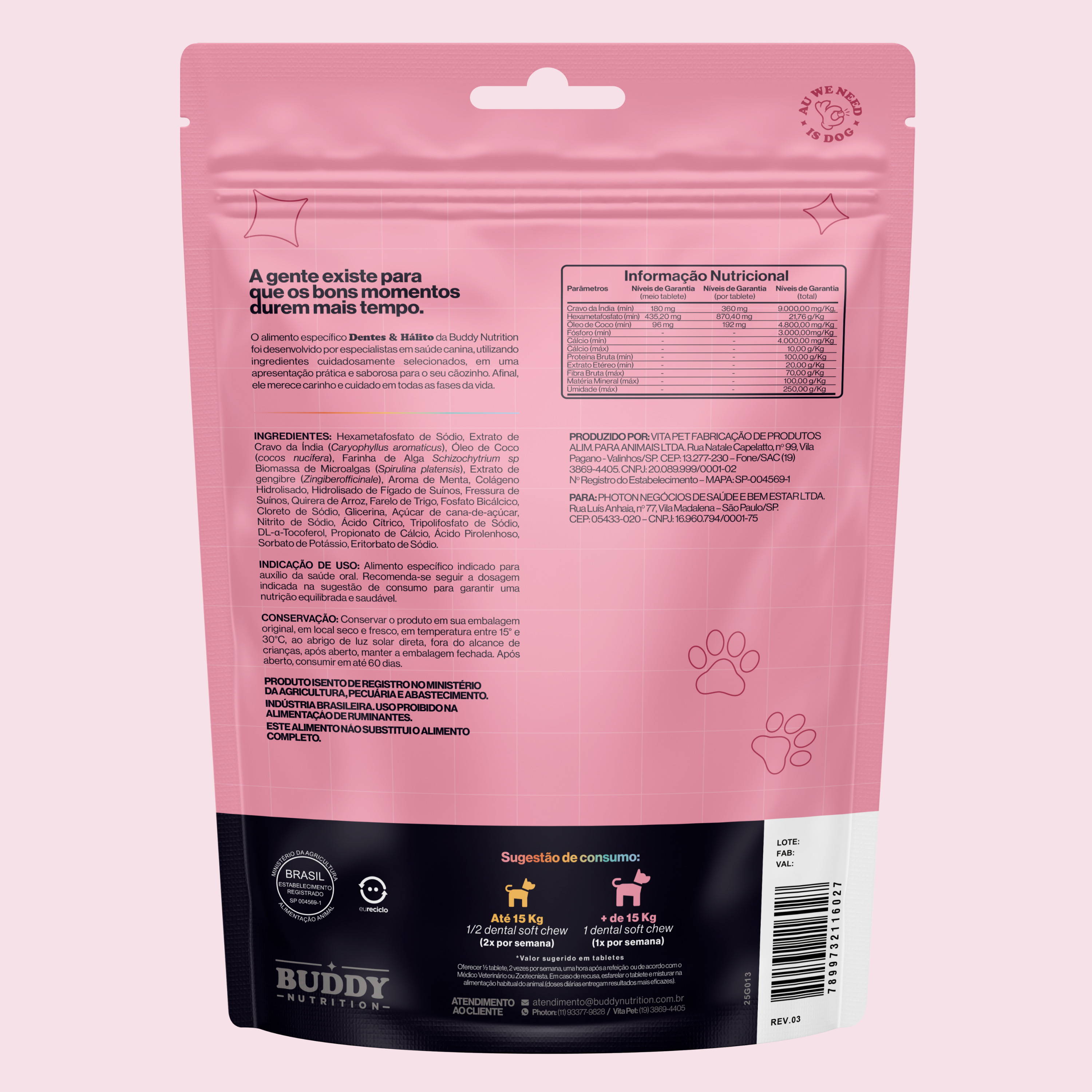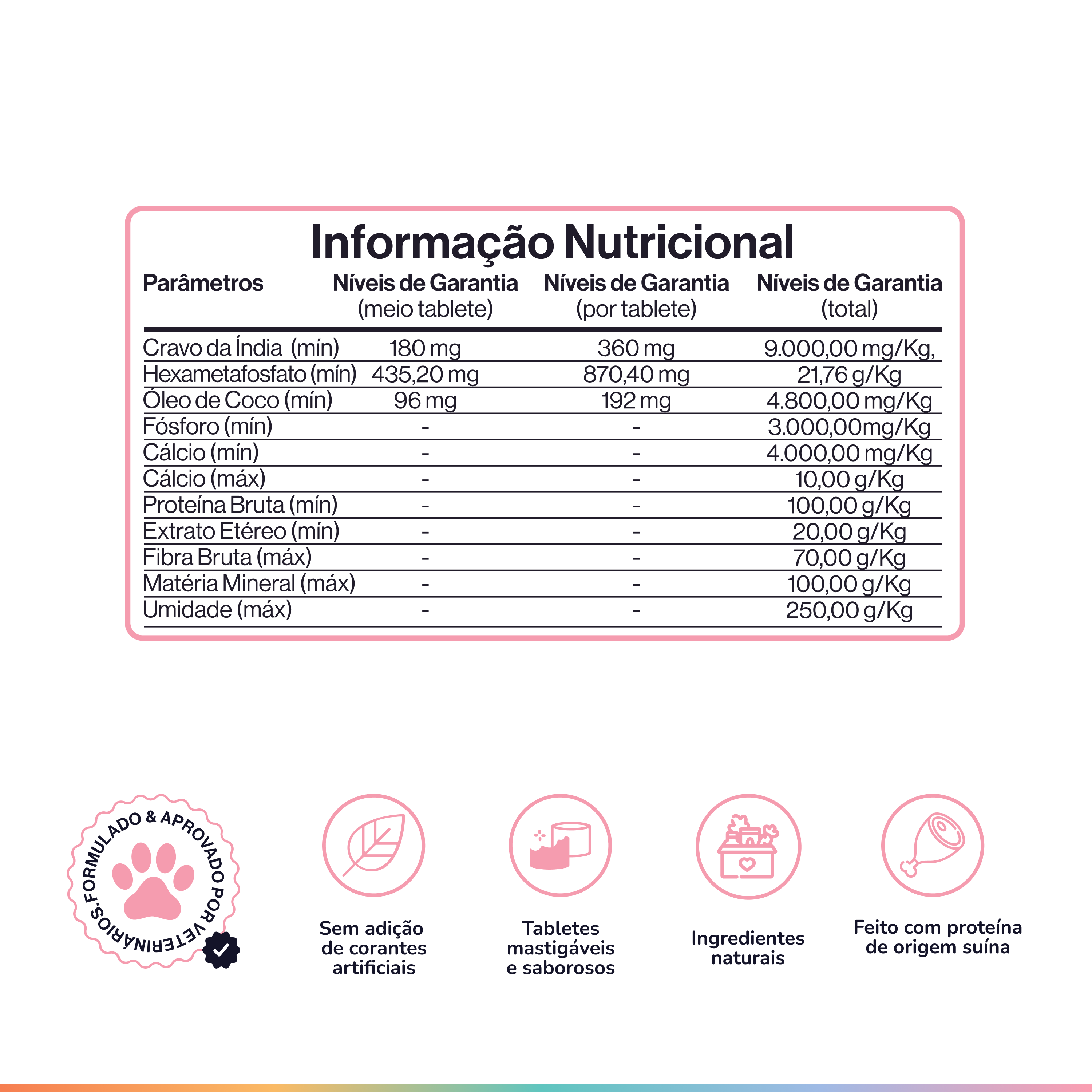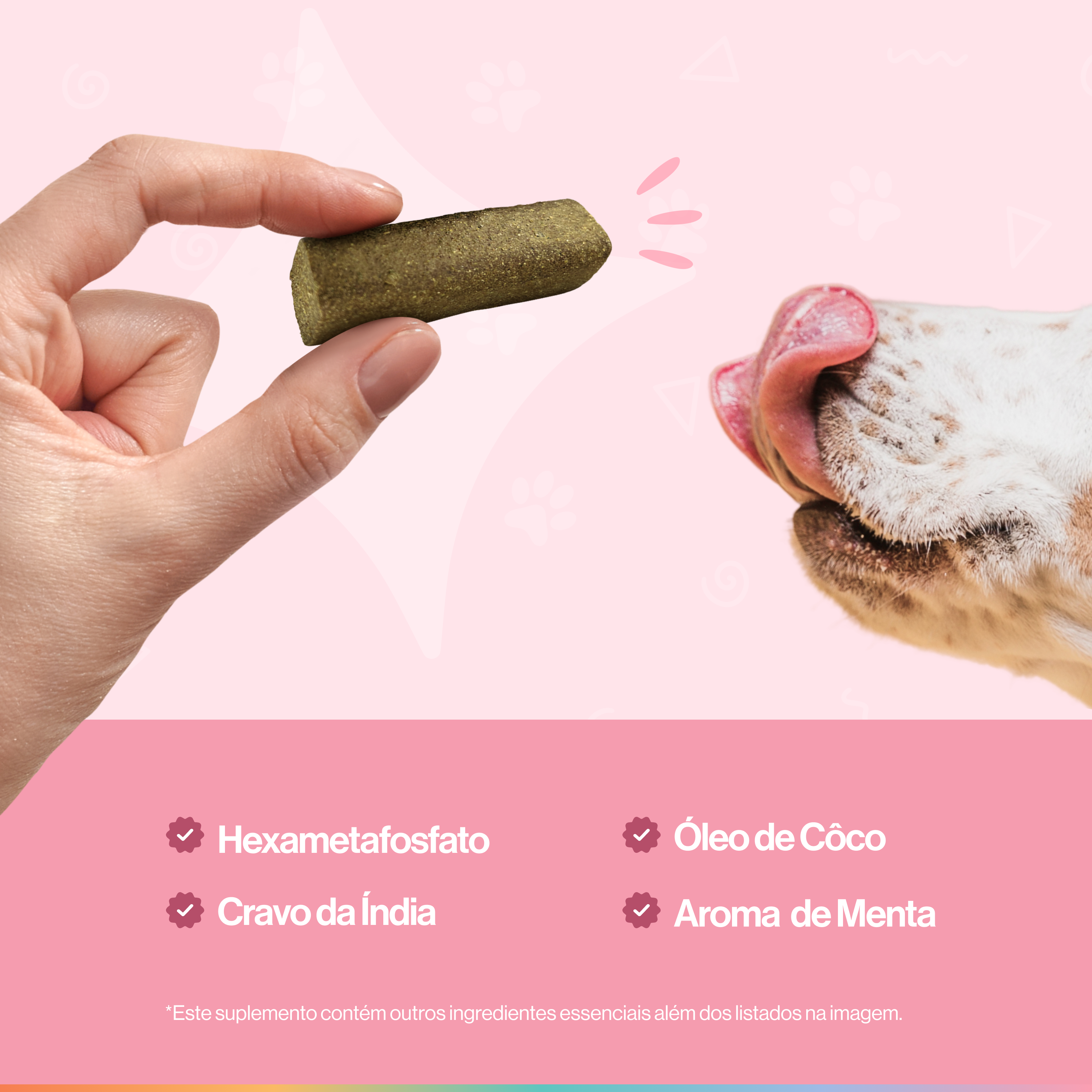 A formulação do suplemento Dentes & Hálito foi desenvolvida com base em estudos científicos e orientações de veterinários especializados em nutrição animal.
