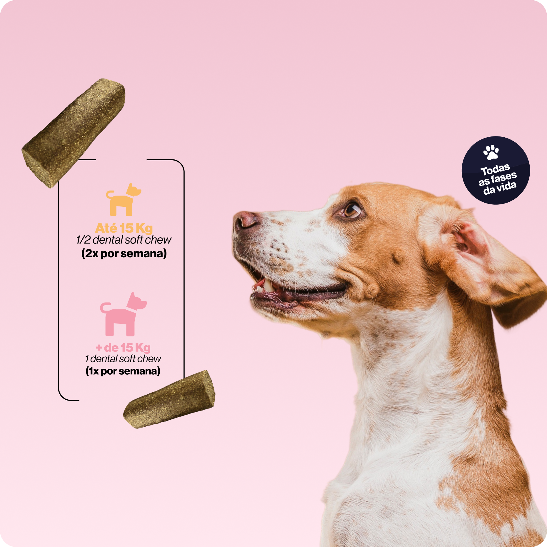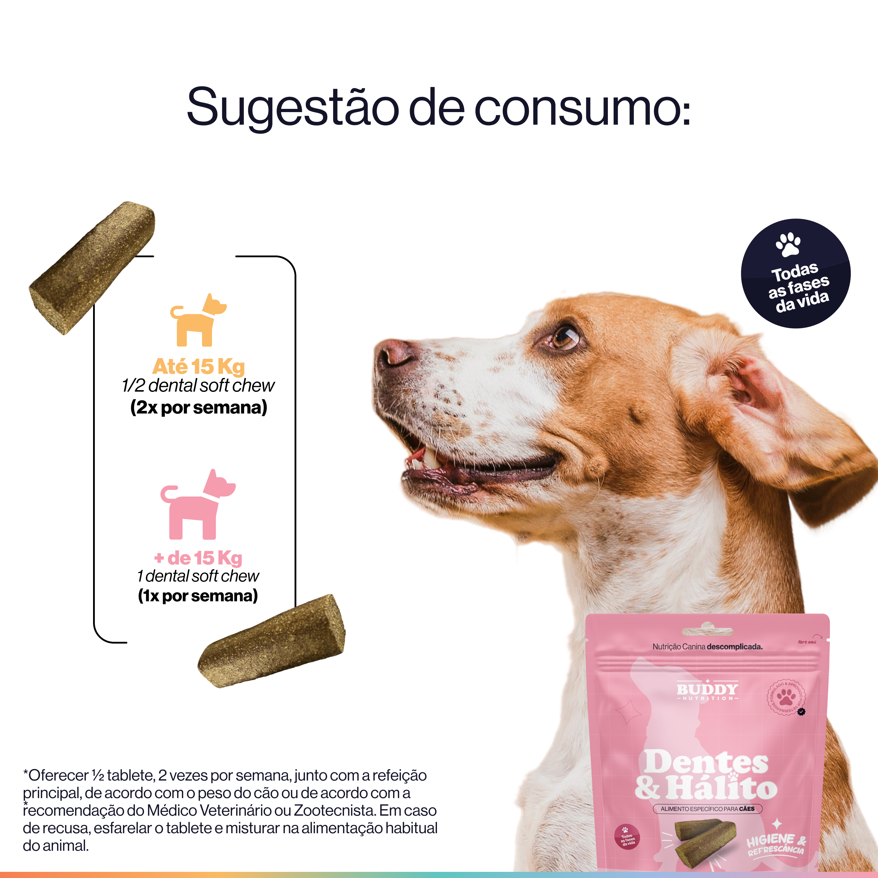 É indicado para todas as raças e portes, a partir dos 3 meses de idade. Funciona tanto para cães que já apresentam sinais de saúde bucal comprometida, quanto para tutores que querem cuidar dos dentes antes que os sinais apareçam.