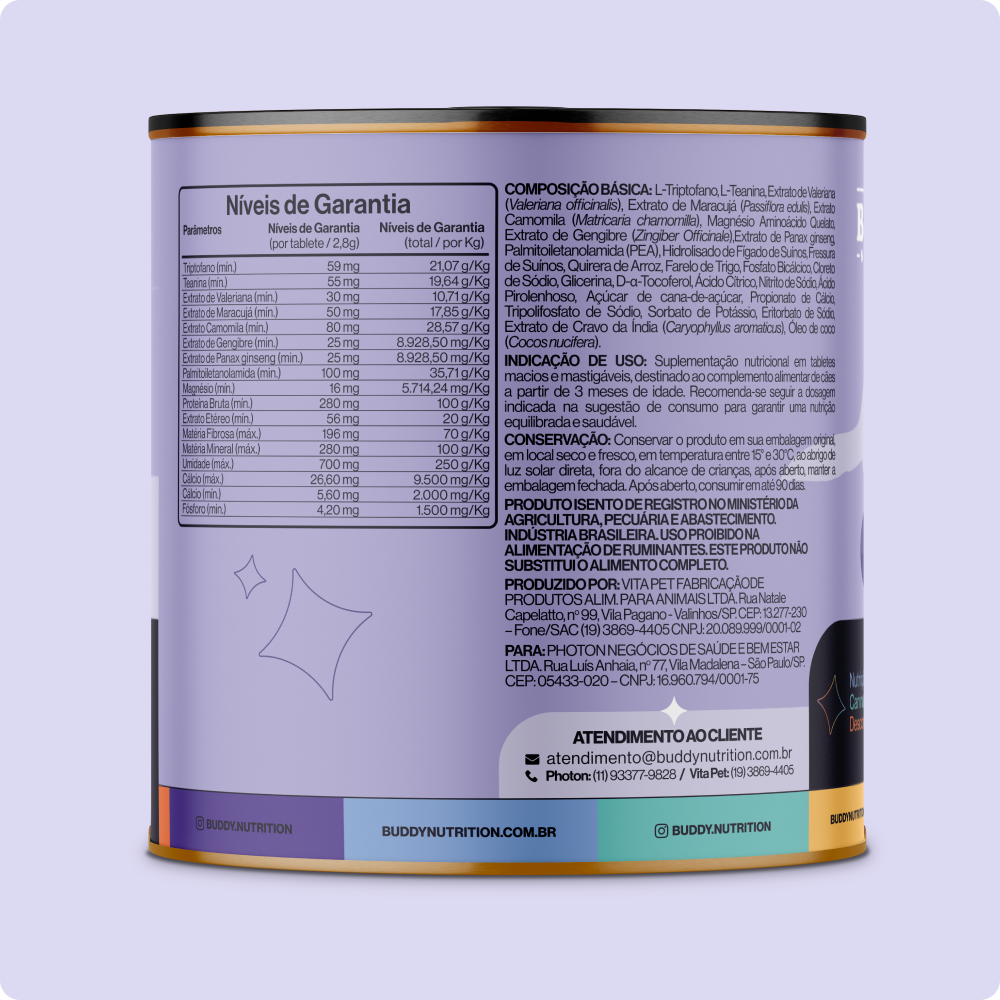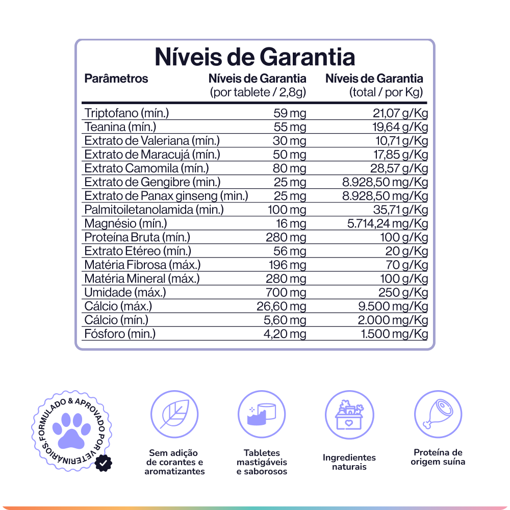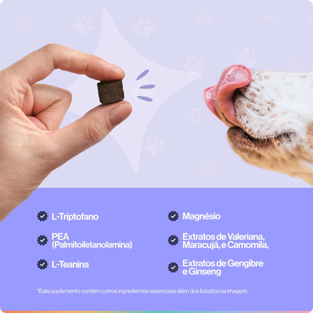 Formulado com L-Teanina, L-Triptofano e PEA - composto naturalmente presente no organismo, com evidência clínica em cães. Um diferencial que nenhum outro suplemento oferece