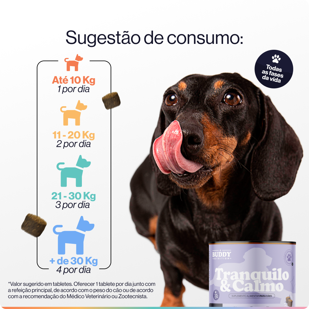 O suplemento Tranquilo & Calmo foi feito para ajudar no bem-estar do seu cão. No entanto, como cada animal é único, o uso contínuo do suplemento deve ser acompanhado. Recomendamos que você fale com o veterinário do seu buddy antes de usar o suplemento por muito tempo, para garantir que ele seja adequado e seguro para o seu cão. O acompanhamento do veterinário é importante para saber a melhor forma de dar o suplemento ao seu amigão.