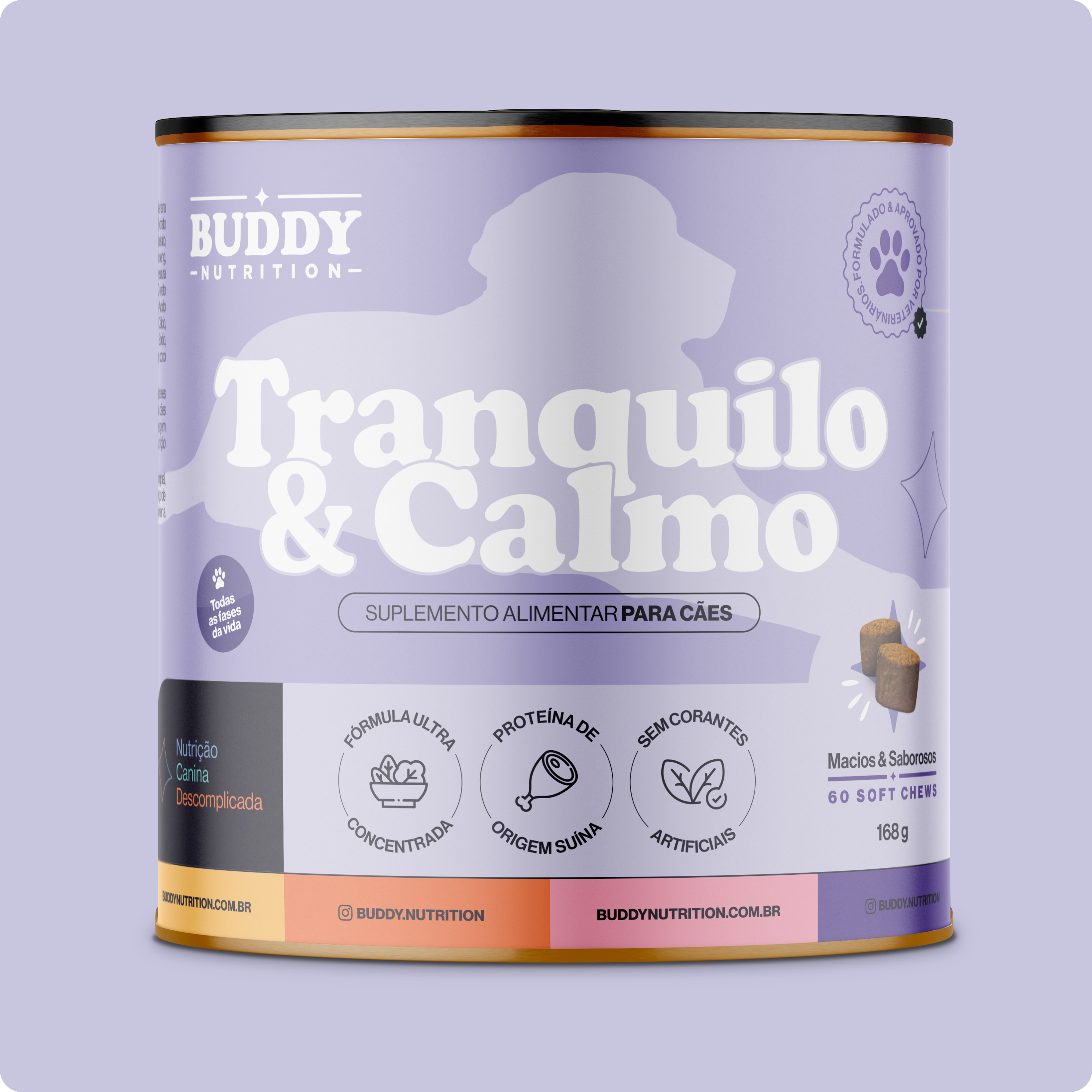 E para que esse cuidado realmente faça parte da rotina, o Tranquilo & Calmo é um suplemento em formato de soft chew (petisco), com 98% de aceitação. Porque cuidar do estresse do seu cão só funciona quando ele aceita - ou melhor, pede.