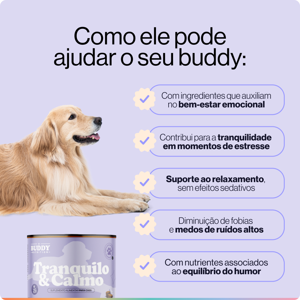 Cães que tremem com fogos são os mais óbvios, mas se o seu Buddy fica agitado quando você sai, destrói coisas em casa, ou vive em alerta constante - o Tranquilo & Calmo foi feito pra ele.
