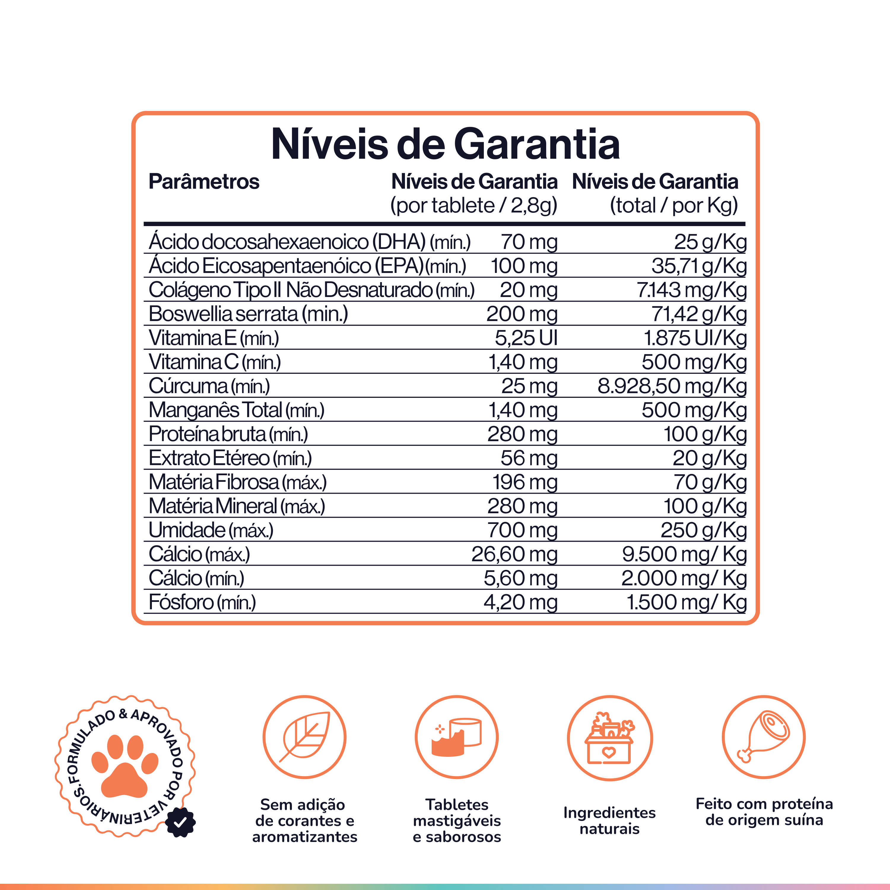 Fórmula 4 em 1 desenvolvida por PhDs com ingredientes selecionados para apoiar a nutrição articular e a mobilidade de cães. Resultados podem variar - tutores costumam perceber diferença a partir de 4 semanas de uso contínuo.