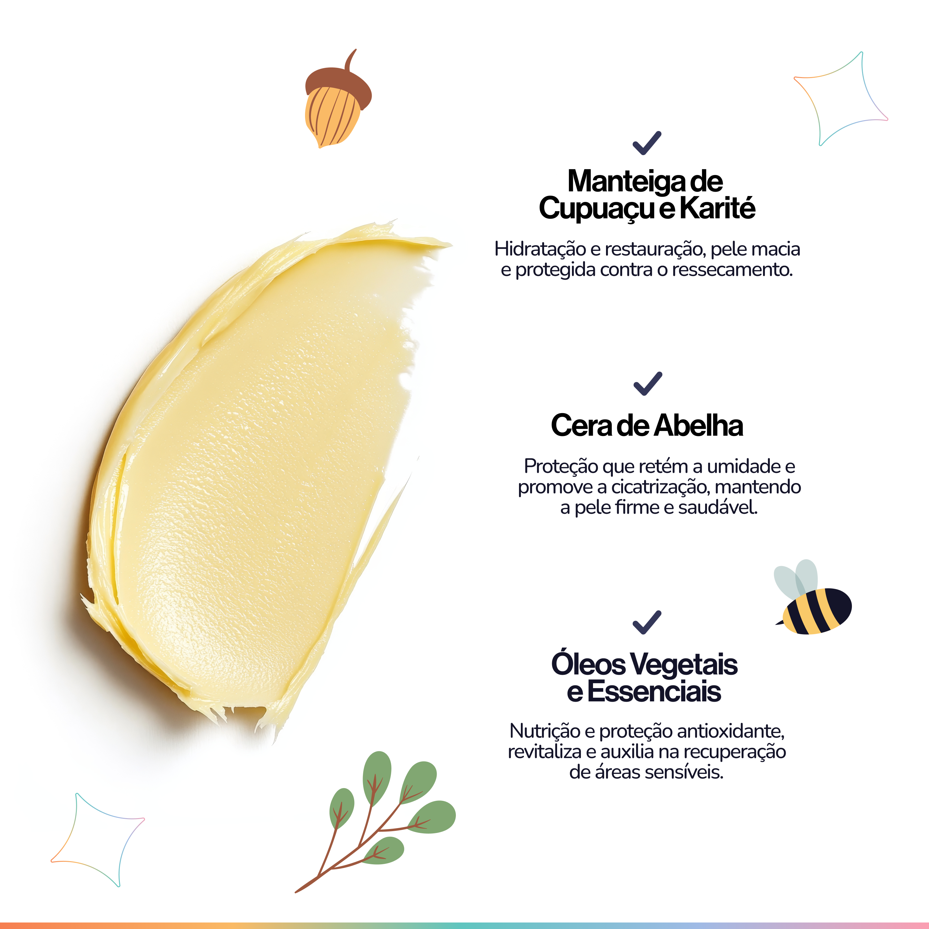 Com uma fórmula rica em ingredientes naturais, como Manteiga de Cupuaçu, Cera de Abelha, Manteiga de Karité e Óleos Essenciais, o Patas & Focinho oferece hidratação intensa, cicatrização rápida e proteção contra o ressecamento. Ideal para prevenir irritações, rachaduras e desconfortos.