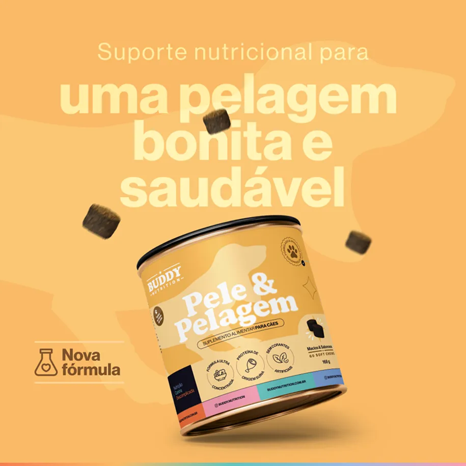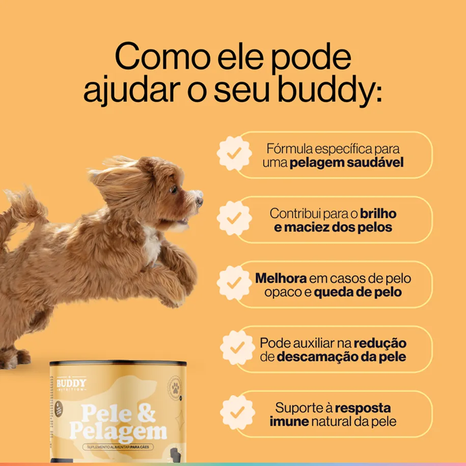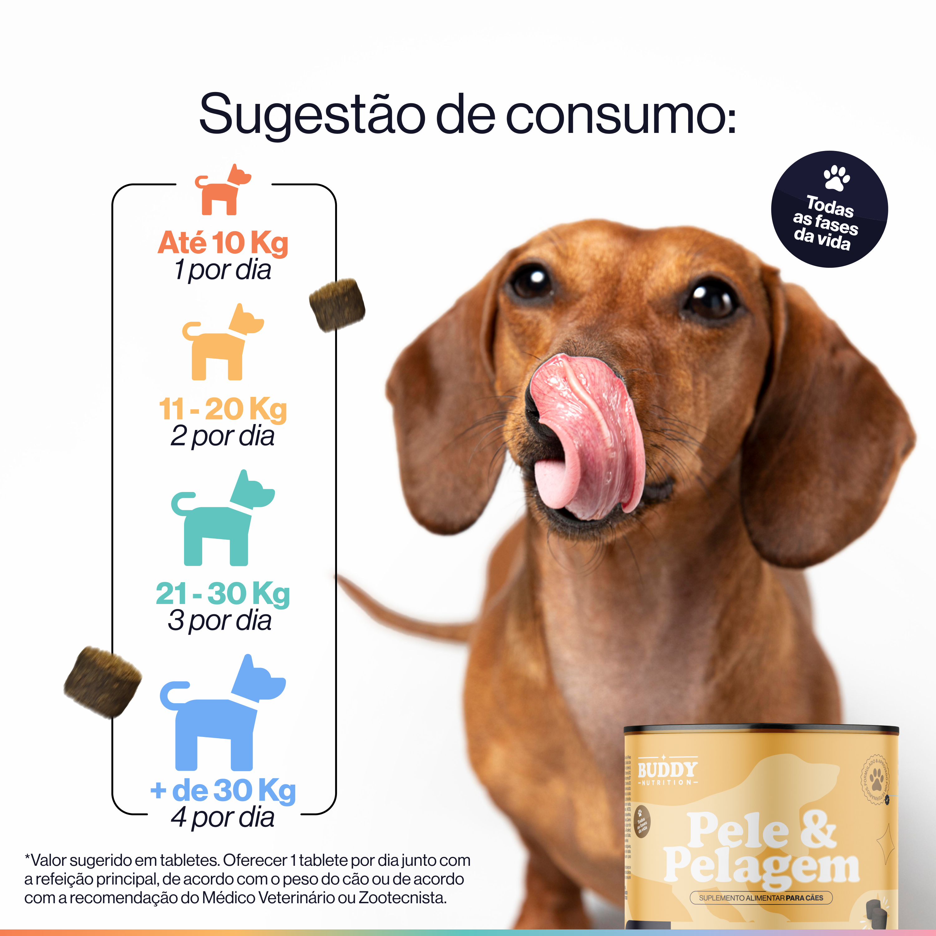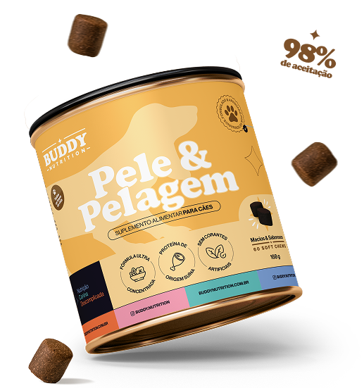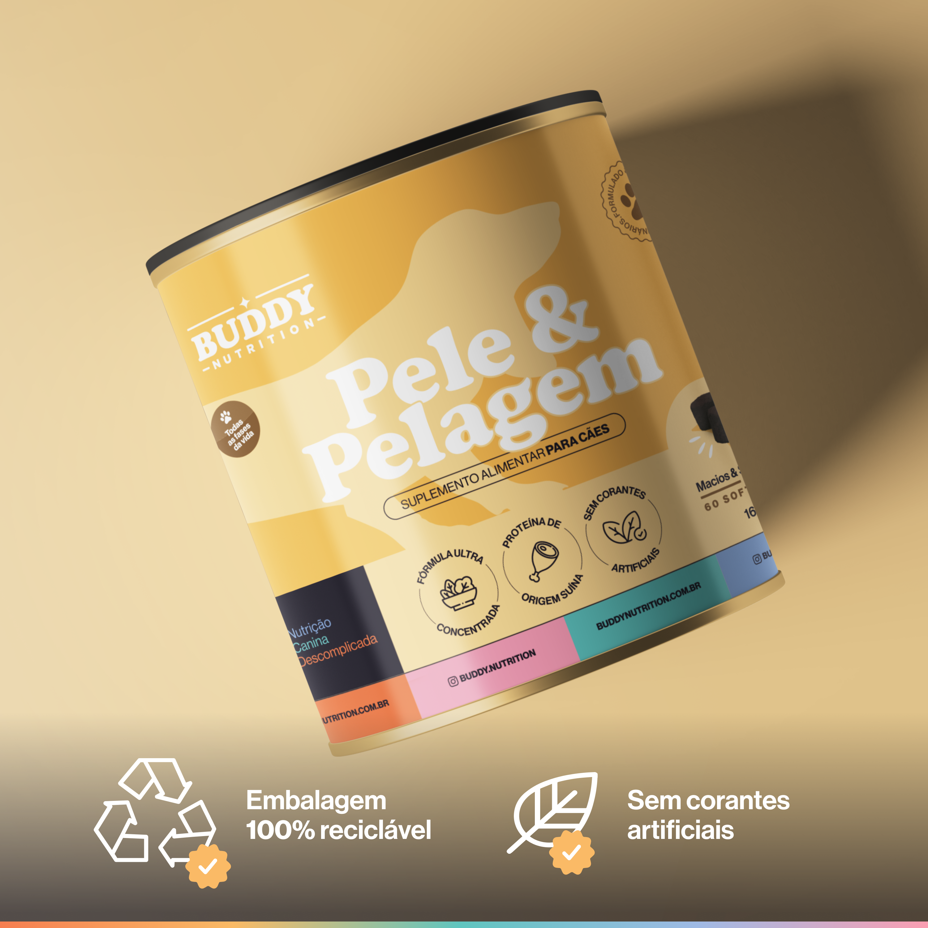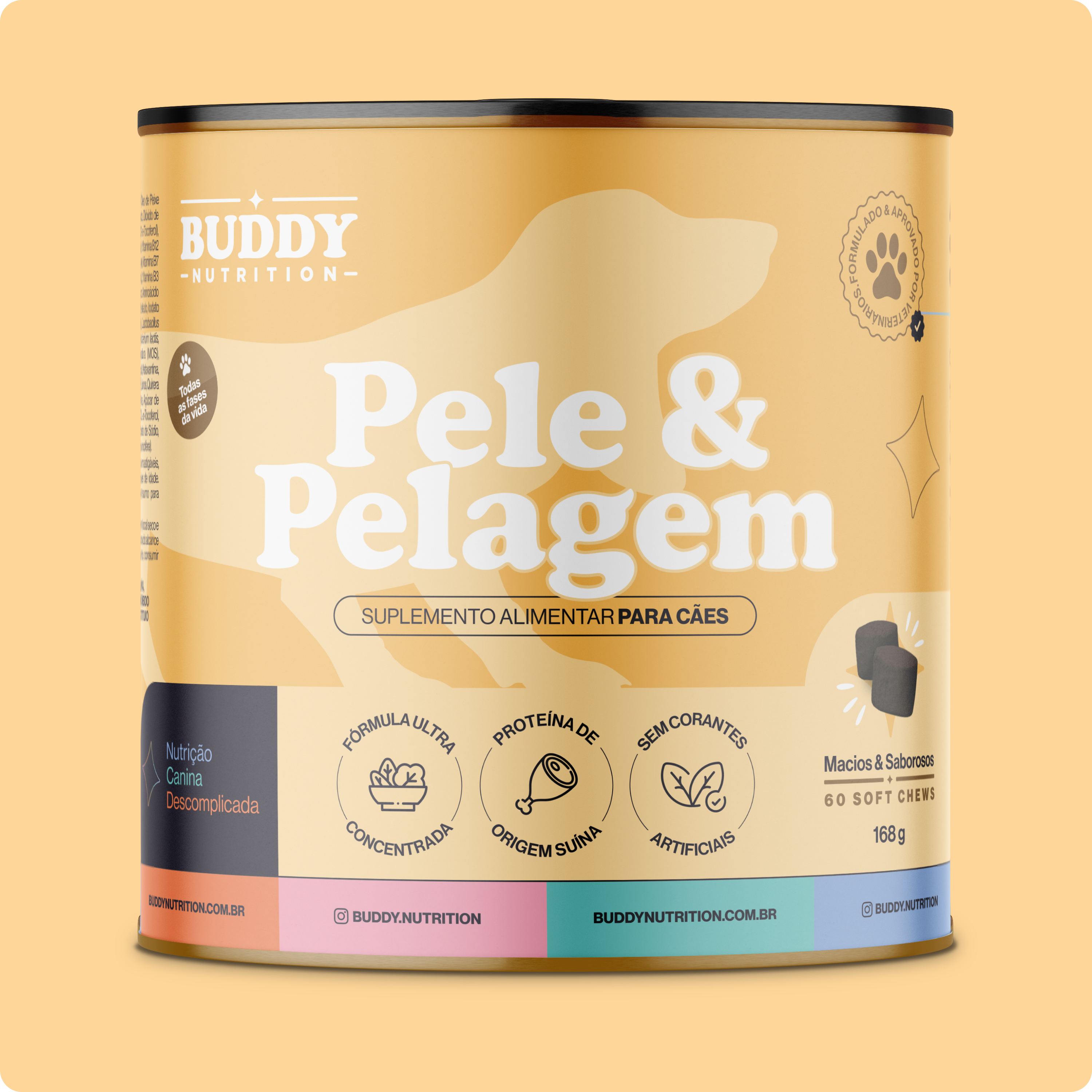 Mas, se o seu Buddy tem sensibilidade recorrente, pele reativa, vermelhidão ou a pelagem ficou opaca e rala, o Pele & Pelagem foi feito pra ele.