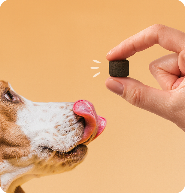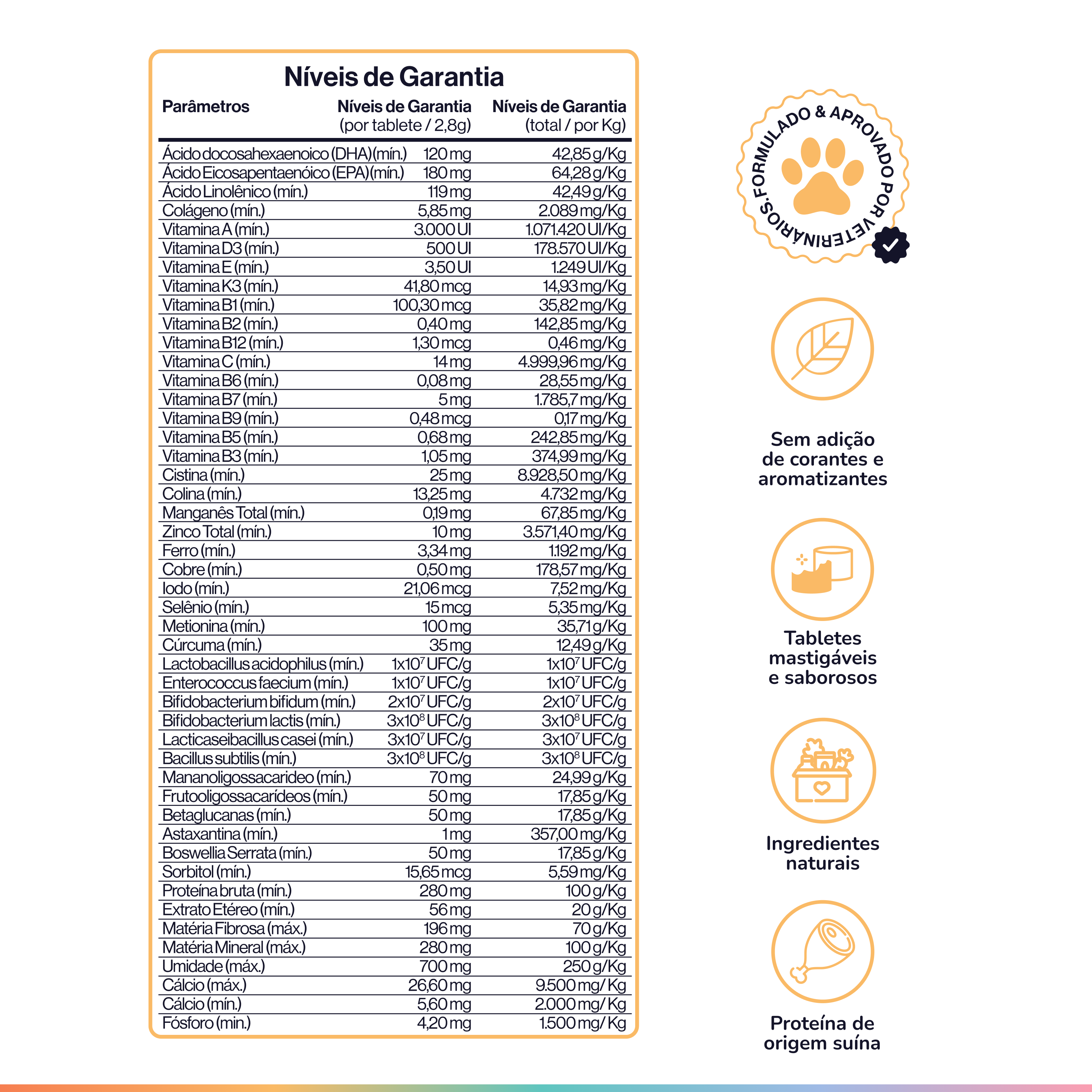 40+ ingredientes para cuidar da saúde da pele e pelagem em deliciosos tabletes sabor carne.
