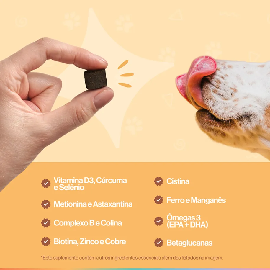 Os suplementos fornecem nutrientes importantes para a saúde da pele e pelagem. A percepção dos benefícios pode variar conforme o metabolismo, alimentação e cuidados gerais de cada cão. Cada animal responde de maneira única à suplementação, e os resultados dependem de fatores como raça, idade e dieta. Este suplemento não substitui uma alimentação equilibrada nem o acompanhamento veterinário. Para orientações específicas, consulte um profissional.